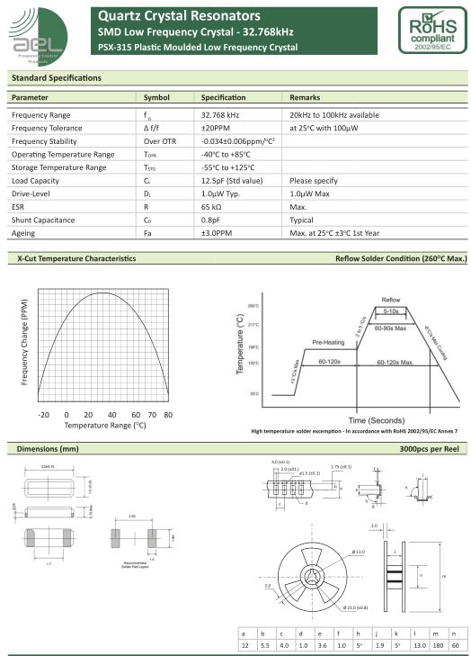 AEL晶振,PSX-315晶振,32.768KHZ晶振,貼片表晶32.768K系列具有超小型,薄型,質(zhì)地輕的表面貼片音叉型石英晶體振蕩器,晶振產(chǎn)品本身具備優(yōu)良的耐熱性,耐環(huán)境特性,在辦公自動(dòng)化,家電領(lǐng)域,移動(dòng)通信領(lǐng)域可發(fā)揮優(yōu)良的電氣特性,符合無(wú)鉛標(biāo)準(zhǔn),滿足無(wú)鉛焊接的回流溫度曲線要求,金屬外殼的石英晶振使得產(chǎn)品在封裝時(shí)能發(fā)揮比陶瓷晶振外殼更好的耐沖擊性能.