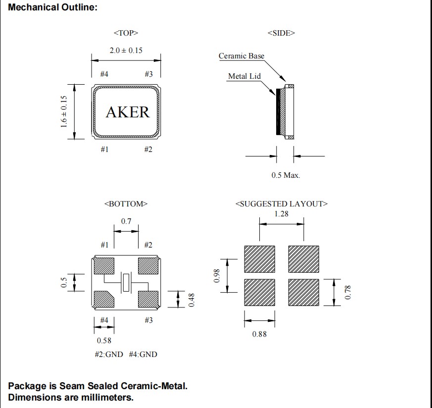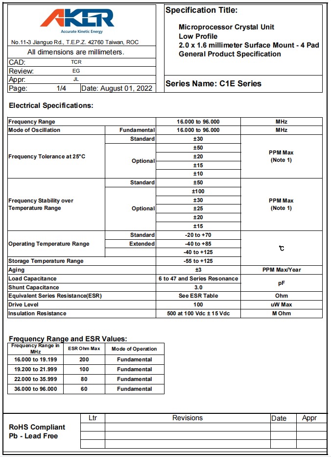 | C1E-16.000-10-1530-X-R | Aker安碁晶振 | 石英晶體 | Microprocessor Crystal Unit Low Profile 2.0 x 1.6 millimeter Surface Mount |