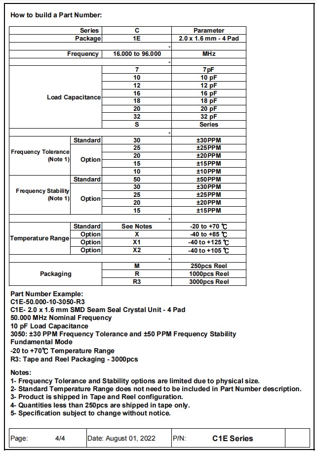 | C1E-50.000-10-1530-X-R | Aker安碁晶振 | 石英晶體 | Crystal 50MHz ±15ppm (Tol) ±30ppm (Stability) 10pF FUND 60Ohm 4-Pin SMD T/R |