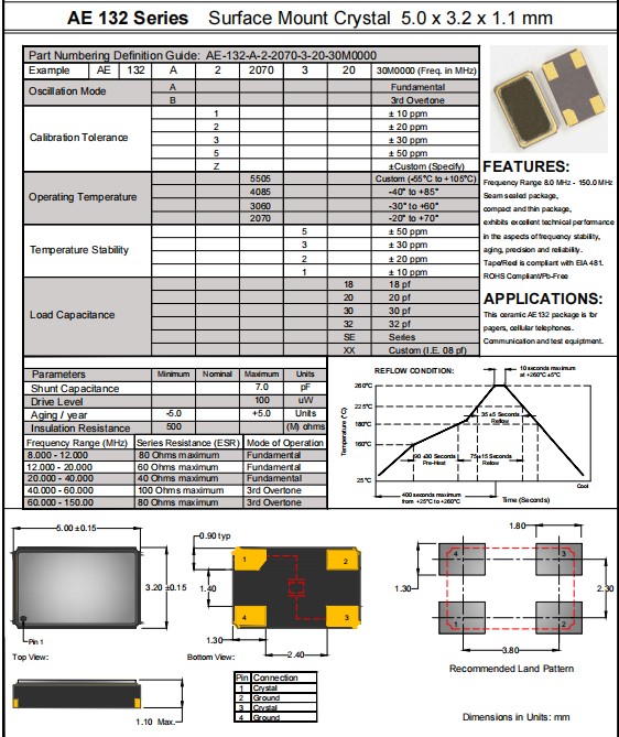 Anderson進(jìn)口晶振,AE-132-A-3-5505-2-20-50M0000,尋呼機(jī)6G晶振,AE132晶體諧振器,四腳貼片晶振,美國進(jìn)口晶振,Anderson安德森貼片晶振,型號(hào):AE132,編碼為:AE-132-A-3-5505-2-20-50M0000,頻率為:50.000MHz,小體積晶振尺寸:5.0x3.2x1.1mm,四腳貼片晶振,無源晶振,石英晶振,SMD石英晶體,石英晶體諧振器,具有超小型,輕薄型,密封封裝,緊湊薄,在頻率穩(wěn)定性、老化、精度和可靠性方面具有優(yōu)異的技術(shù)性能。磁帶/卷軸符合EIA 481標(biāo)準(zhǔn)。符合ROHS標(biāo)準(zhǔn)/無鉛標(biāo)準(zhǔn)。這個(gè)陶瓷AE132包是為尋呼機(jī),移動(dòng)電話。通信設(shè)備,測試設(shè)備,安防設(shè)備,車載電子等應(yīng)用。