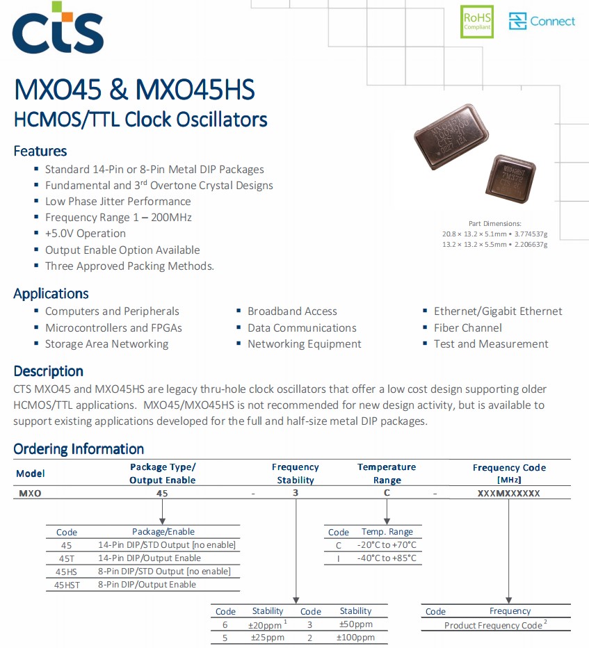HCMOS時鐘振蕩器,MXO45-3C-18M4320,CTS有源晶振,參數(shù)表