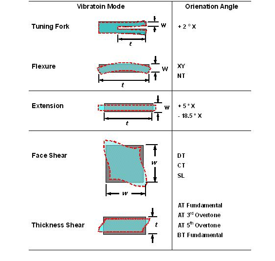經(jīng)由不同的石英切割角度及不同電極型狀的電場(chǎng)效應(yīng), 石英芯片展現(xiàn)了各種不同的振動(dòng)模態(tài). 以經(jīng)常產(chǎn)生的振動(dòng)模態(tài)可以概分為擾曲模態(tài)(flexure mode), 伸縮模態(tài)(extension mode), 面剪切模態(tài)(face shear mode) 和 厚度剪切模態(tài)(thickness shear mode). 這幾種振動(dòng)模態(tài)以簡(jiǎn)單的方法在表一中可以看到. 在實(shí)際狀況中, 石英芯片并不是一定祇有單一種振動(dòng)模態(tài), "7M-24.000MAAJ-T"而可能有多種模態(tài)同時(shí)存在在一個(gè)石英芯片的振蕩中, 經(jīng)由適當(dāng)?shù)脑O(shè)計(jì), 可以壓制其它不希望產(chǎn)生的振動(dòng)模態(tài)(unwanted mode), 來(lái)達(dá)到主要振動(dòng)模態(tài)的最佳化.
