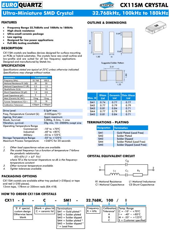 Euroquartz晶振,CX11SM晶振,CX11SC-SM1-32.768K,100/I晶振,32.768K時鐘晶體具有小型,薄型,輕型的貼片晶振表面音叉型晶體振蕩器,產(chǎn)品具有優(yōu)良的耐熱性,耐環(huán)境特性,可發(fā)揮晶振優(yōu)良的電氣特性,符合RoHS規(guī)定,滿足無鉛焊接的高溫回流溫度曲線要求,金屬外殼的封裝使得產(chǎn)品在封裝時能發(fā)揮比陶瓷振蕩器外殼更好的耐沖擊性.