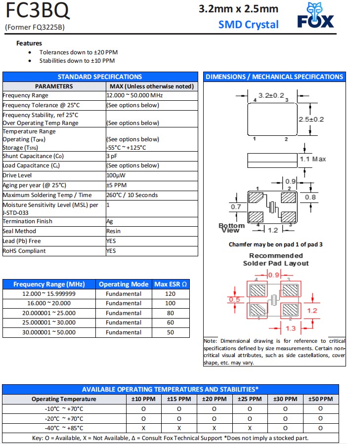 | FQ3225B-12.000 | Fox晶振 | FQ3225B | 12MHz | ±50ppm |