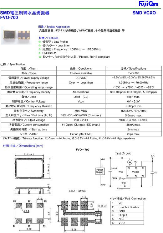 Fujicom晶振,FVO-700晶振,VCXO壓控晶振,小型SMD有源晶振,從最初超大體積到現(xiàn)在的7050mm,6035mm,5032mm,3225mm,2520mm體積,有著翻天覆地的改變,體積的變小也使產(chǎn)品帶來(lái)了更高的穩(wěn)定性能,接縫密封石英晶體振蕩器,精度高,覆蓋頻率范圍寬的特點(diǎn),SMD高速自動(dòng)安裝和高溫回流焊設(shè)計(jì),Optionable待機(jī)輸出三態(tài)輸出功能,電源電壓范圍:1.8V~5V,高穩(wěn)定性,低抖動(dòng),低功耗,主要應(yīng)用領(lǐng)域:無(wú)線通訊,高端智能手機(jī),平板筆記本W(wǎng)LAN,藍(lán)牙,數(shù)碼相機(jī),DSL和其他IT產(chǎn)品的晶振應(yīng)用,三態(tài)功能,PC和LCDM等高端數(shù)碼領(lǐng)域,符合RoHS/無(wú)鉛.