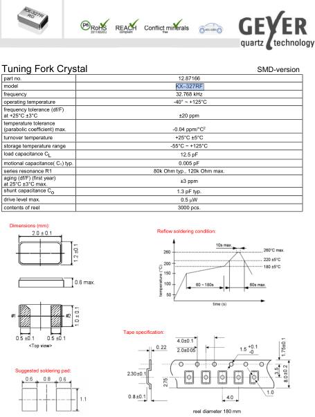 Geyer晶振,KX-327RF晶振,無源兩腳晶振,超小型,薄型,質(zhì)地輕的表面貼片音叉型晶體振蕩器,手機(jī)晶體,產(chǎn)品體積小,特別適用于各種小巧的便攜式消費(fèi)電子數(shù)碼產(chǎn)品,在移動(dòng)通信領(lǐng)域得到了廣泛的應(yīng)用,晶振產(chǎn)品本身可發(fā)揮優(yōu)良的電氣特性,滿足無鉛焊接的高溫回流溫度曲線要求.