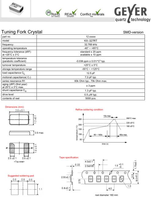 Geyer晶振,KX-327RT晶振,2012mm無源晶振,貼片表晶32.768K系列具有超小型,薄型,質(zhì)地輕的表面貼片音叉型石英晶體振蕩器,晶振產(chǎn)品本身具備優(yōu)良的耐熱性,耐環(huán)境特性,在辦公自動化,家電領(lǐng)域,移動通信領(lǐng)域可發(fā)揮優(yōu)良的電氣特性,符合無鉛標準,滿足無鉛焊接的回流溫度曲線要求,金屬外殼的石英晶振使得產(chǎn)品在封裝時能發(fā)揮比陶瓷晶振外殼更好的耐沖擊性能.