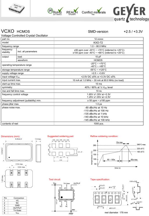 耶格晶振,KXO-72晶振,VCXO壓控晶振,5032mm體積的石英晶體振蕩器,有源晶振,該產(chǎn)品可驅(qū)動2.5V的溫補(bǔ)晶振,壓控晶振,VC-TCXO晶體振蕩器產(chǎn)品,電源電壓的低電耗型,編帶包裝方式,可對應(yīng)自動高速貼片機(jī)自動焊接,及IR回流焊接(無鉛對應(yīng)),為無鉛產(chǎn)品,超小型,質(zhì)地輕.產(chǎn)品被廣泛應(yīng)用到集成電路,程控交換系統(tǒng),無線發(fā)射基站.