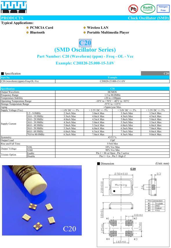 ITTI晶振,C20晶振,C20H20-20.000-15-3.0V晶振,有源晶振,是指晶體本身起振需要外部電壓供應(yīng),起振后可直接驅(qū)動(dòng)CMOS集成電路,產(chǎn)品本身已實(shí)現(xiàn)與薄型IC(TSSOP封裝,TVSOP封裝)同樣的1mm厚度,斷開時(shí)的消費(fèi)電流是15µA以下,編帶包裝方式可對(duì)應(yīng)自動(dòng)搭載及IR回流焊接(無鉛對(duì)應(yīng))產(chǎn)品有幾種電壓供選1.8V,2.5V,3V3.3V,5V,以應(yīng)對(duì)不同IC產(chǎn)品需要.