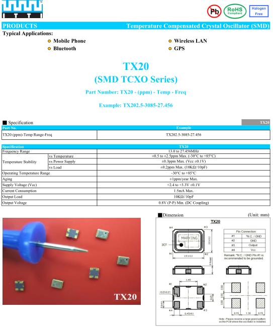 ITTI晶振,TX20晶振,TX202.5-3085-24.000晶振,有源晶振,是指晶體本身起振需要外部電壓供應,起振后可直接驅(qū)動CMOS集成電路,產(chǎn)品本身已實現(xiàn)與薄型IC(TSSOP封裝,TVSOP封裝)同樣的1mm厚度,斷開時的消費電流是15µA以下,編帶包裝方式可對應自動搭載及IR回流焊接(無鉛對應)產(chǎn)品有幾種電壓供選1.8V,2.5V,3V3.3V,5V,以應對不同IC產(chǎn)品需要.