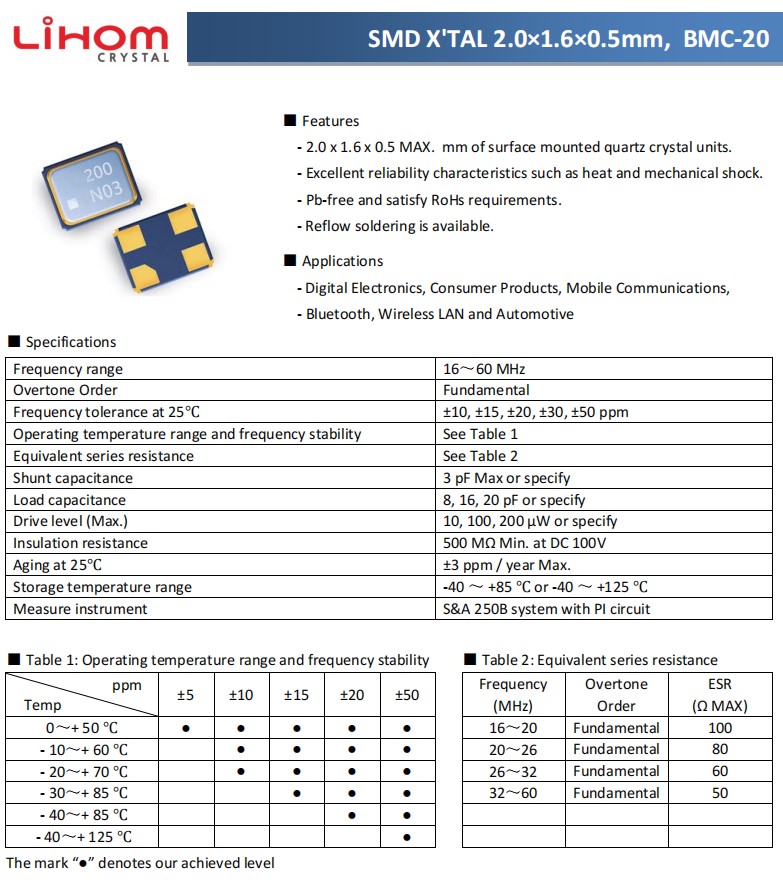 Lihom石英晶體諧振器,BMC-20輕薄型晶振,汽車電子6G晶振,SMD石英晶體,消費電子晶振,參數(shù)表