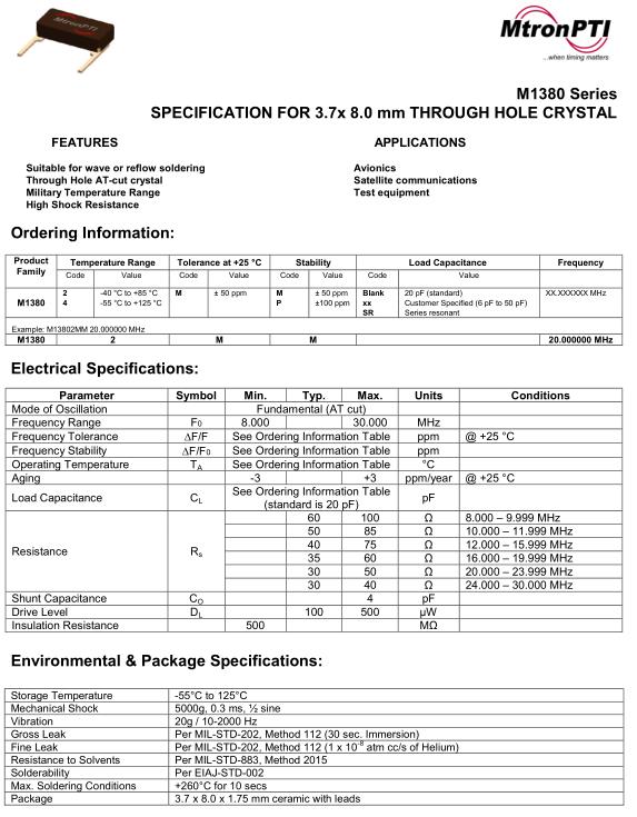 MtronPTI晶振,M1380晶振,M13802MM20.000000MHz晶振,貼片晶振本身體積小,超薄型石英晶體振蕩器,特別適用于有目前高速發(fā)展的高端電子數(shù)碼產(chǎn)品,因為晶振本身小型化需求的市場領(lǐng)域,小型,薄型是對應(yīng)陶瓷振蕩器(偏差大)和普通的石英晶體振蕩器(偏差小)的中間領(lǐng)域的一種性價比較出色的產(chǎn)品.產(chǎn)品廣泛用于筆記本電腦,無線電話,衛(wèi)星導(dǎo)航SSD,USB,Blu-ray等用途,符合無鉛焊接的高溫回流焊曲線特性.