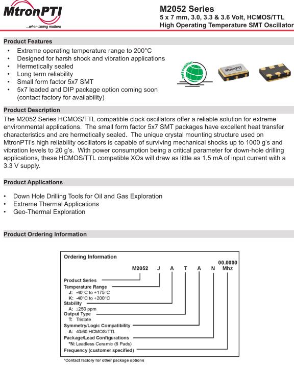 MtronPTI晶振,M2052晶振,M2052JATAN16.0000MHz晶振,小型SMD有源晶振,從最初超大體積到現(xiàn)在的7050mm,6035mm,5032mm,3225mm,2520mm體積,有著翻天覆地的改變,體積的變小也使產(chǎn)品帶來了更高的穩(wěn)定性能,接縫密封石英晶體振蕩器,精度高,覆蓋頻率范圍寬的特點(diǎn),SMD高速自動(dòng)安裝和高溫回流焊設(shè)計(jì),Optionable待機(jī)輸出三態(tài)輸出功能,電源電壓范圍:1.8V~5V,高穩(wěn)定性,低抖動(dòng),低功耗,主要應(yīng)用領(lǐng)域:無線通訊,高端智能手機(jī),平板筆記本W(wǎng)LAN,藍(lán)牙,數(shù)碼相機(jī),DSL和其他IT產(chǎn)品的晶振應(yīng)用,三態(tài)功能,PC和LCDM等高端數(shù)碼領(lǐng)域,符合RoHS/無鉛.