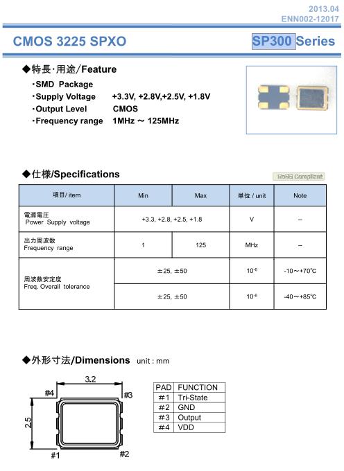 NAKA晶振,SP300晶振,SPXO普通有源晶振,小型SMD有源晶振,從最初超大體積到現(xiàn)在的7050mm,6035mm,5032mm,3225mm,2520mm體積,有著翻天覆地的改變,體積的變小也使產(chǎn)品帶來(lái)了更高的穩(wěn)定性能,接縫密封石英晶體振蕩器,精度高,覆蓋頻率范圍寬的特點(diǎn),SMD高速自動(dòng)安裝和高溫回流焊設(shè)計(jì),Optionable待機(jī)輸出三態(tài)輸出功能,電源電壓范圍:1.8V~5V,高穩(wěn)定性,低抖動(dòng),低功耗,主要應(yīng)用領(lǐng)域:無(wú)線通訊,高端智能手機(jī),平板筆記本W(wǎng)LAN,藍(lán)牙,數(shù)碼相機(jī),DSL和其他IT產(chǎn)品的晶振應(yīng)用,三態(tài)功能,PC和LCDM等高端數(shù)碼領(lǐng)域,符合RoHS/無(wú)鉛.