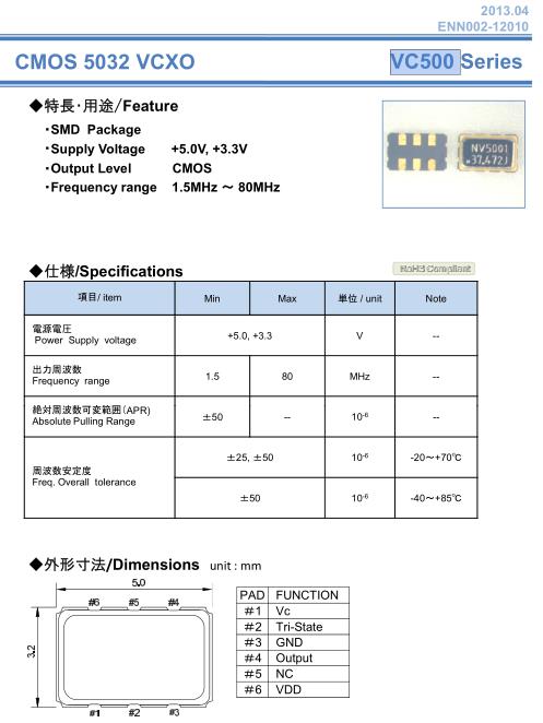 納卡晶振,VC500晶振,VCXO壓控晶振,5032mm體積的石英晶體振蕩器,有源晶振,該產(chǎn)品可驅(qū)動(dòng)2.5V的溫補(bǔ)晶振,壓控晶振,VC-TCXO晶體振蕩器產(chǎn)品,電源電壓的低電耗型,編帶包裝方式,可對(duì)應(yīng)自動(dòng)高速貼片機(jī)自動(dòng)焊接,及IR回流焊接(無鉛對(duì)應(yīng)),為無鉛產(chǎn)品,超小型,質(zhì)地輕.產(chǎn)品被廣泛應(yīng)用到集成電路,程控交換系統(tǒng),無線發(fā)射基站.