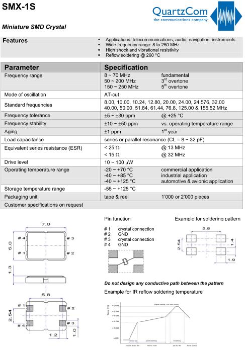 QuartzCom晶振,SMX-1S晶振,無(wú)源四腳晶振,貼片晶振本身體積小,超薄型石英晶體振蕩器,特別適用于有目前高速發(fā)展的高端電子數(shù)碼產(chǎn)品,因?yàn)榫д癖旧硇⌒突枨蟮氖袌?chǎng)領(lǐng)域,小型,薄型是對(duì)應(yīng)陶瓷振蕩器(偏差大)和普通的石英晶體振蕩器(偏差小)的中間領(lǐng)域的一種性價(jià)比較出色的產(chǎn)品.產(chǎn)品廣泛用于筆記本電腦,無(wú)線電話,衛(wèi)星導(dǎo)航SSD,USB,Blu-ray等用途,符合無(wú)鉛焊接的高溫回流焊曲線特性.