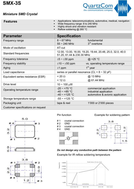 QuartzCom晶振,SMX-3S晶振,無源四腳晶振,小型表面貼片晶振型,是標(biāo)準(zhǔn)的石英晶體振蕩器,適用于寬溫范圍的電子數(shù)碼產(chǎn)品,家電電器及MP3,MP4,播放器,單片機(jī)等領(lǐng)域.可對應(yīng)8.000MHz以上的頻率,在電子數(shù)碼產(chǎn)品,以及家電相關(guān)電器領(lǐng)域里面發(fā)揮優(yōu)良的電氣特性,滿足無鉛焊接的回流溫度曲線要求.