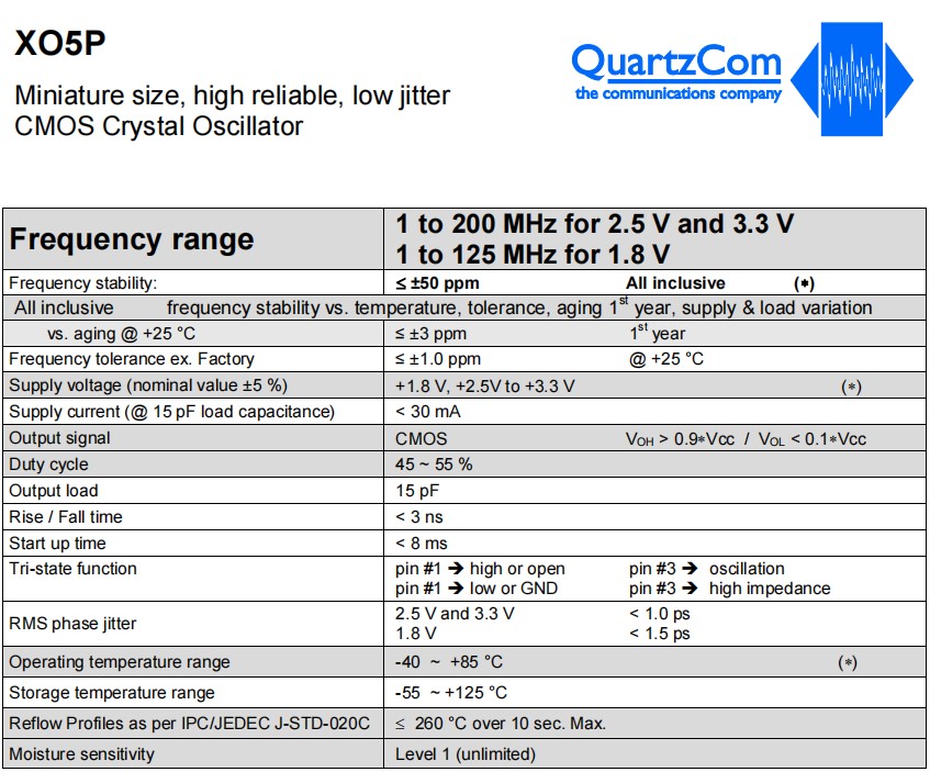 XO5P-H33-NN1u25-156.250MHz,5032mm,QuartzCom石英通晶振,XO5P,石英晶體振蕩器,參數(shù)表