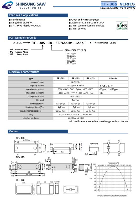 Shinsung晶振,TF-38S晶振,TF-38S-20-32.768KHz-12.5pF晶振,32.768K時(shí)鐘晶體具有小型,薄型,輕型的貼片晶振表面音叉型晶體振蕩器,產(chǎn)品具有優(yōu)良的耐熱性,耐環(huán)境特性,可發(fā)揮晶振優(yōu)良的電氣特性,符合RoHS規(guī)定,滿足無鉛焊接的高溫回流溫度曲線要求,金屬外殼的封裝使得產(chǎn)品在封裝時(shí)能發(fā)揮比陶瓷振蕩器外殼更好的耐沖擊性.