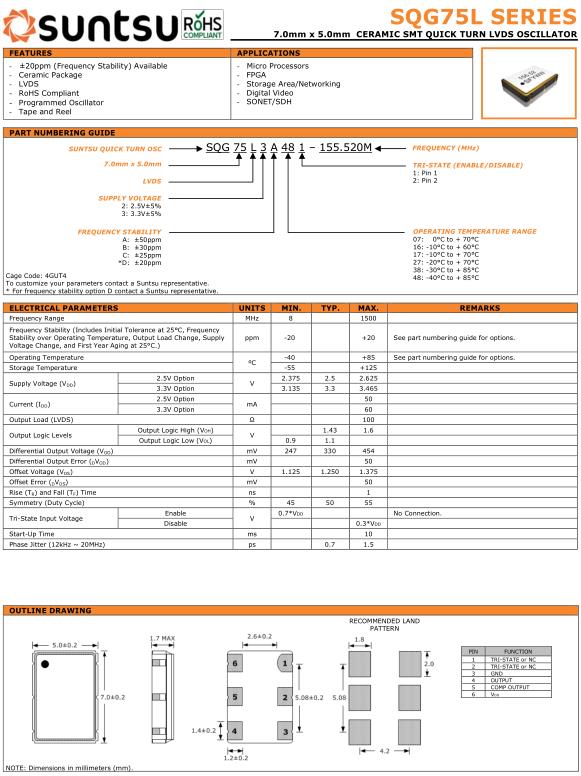 Suntsu晶振,SQG75L晶振,SQG75L3A481-12.000M晶振,小型SMD有源晶振,從最初超大體積到現(xiàn)在的7050mm,6035mm,5032mm,3225mm,2520mm體積,有著翻天覆地的改變,體積的變小也使產(chǎn)品帶來(lái)了更高的穩(wěn)定性能,接縫密封石英晶體振蕩器,精度高,覆蓋頻率范圍寬的特點(diǎn),SMD高速自動(dòng)安裝和高溫回流焊設(shè)計(jì),Optionable待機(jī)輸出三態(tài)輸出功能,電源電壓范圍:1.8V~5V,高穩(wěn)定性,低抖動(dòng),低功耗,主要應(yīng)用領(lǐng)域:無(wú)線通訊,高端智能手機(jī),平板筆記本W(wǎng)LAN,藍(lán)牙,數(shù)碼相機(jī),DSL和其他IT產(chǎn)品的晶振應(yīng)用,三態(tài)功能,PC和LCDM等高端數(shù)碼領(lǐng)域,符合RoHS/無(wú)鉛.