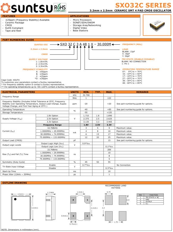 Suntsu晶振,SXO32C晶振,SXO32C3A481X-24.000M晶振,小型SMD有源晶振,從最初超大體積到現(xiàn)在的7050mm,6035mm,5032mm,3225mm,2520mm體積,有著翻天覆地的改變,體積的變小也使產(chǎn)品帶來了更高的穩(wěn)定性能,接縫密封石英晶體振蕩器,精度高,覆蓋頻率范圍寬的特點(diǎn),SMD高速自動安裝和高溫回流焊設(shè)計,Optionable待機(jī)輸出三態(tài)輸出功能,電源電壓范圍:1.8V~5V,高穩(wěn)定性,低抖動,低功耗,主要應(yīng)用領(lǐng)域:無線通訊,高端智能手機(jī),平板筆記本W(wǎng)LAN,藍(lán)牙,數(shù)碼相機(jī),DSL和其他IT產(chǎn)品的晶振應(yīng)用,三態(tài)功能,PC和LCDM等高端數(shù)碼領(lǐng)域,符合RoHS/無鉛.