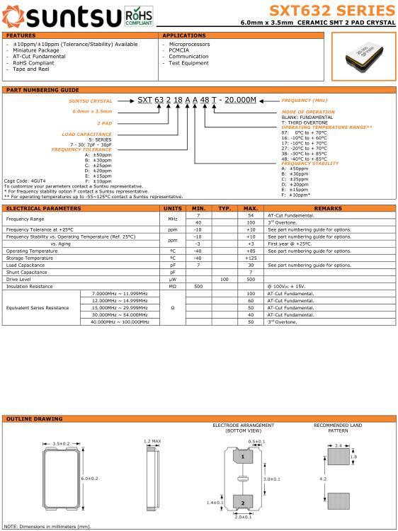 Suntsu晶振,SXT632晶振,SXT63218AA48T-20.000M晶振,貼片晶振本身體積小,超薄型石英晶體振蕩器,特別適用于有目前高速發(fā)展的高端電子數(shù)碼產(chǎn)品,因?yàn)榫д癖旧硇⌒突枨蟮氖袌鲱I(lǐng)域,小型,薄型是對應(yīng)陶瓷振蕩器(偏差大)和普通的石英晶體振蕩器(偏差小)的中間領(lǐng)域的一種性價(jià)比較出色的產(chǎn)品.產(chǎn)品廣泛用于筆記本電腦,無線電話,衛(wèi)星導(dǎo)航SSD,USB,Blu-ray等用途,符合無鉛焊接的高溫回流焊曲線特性.