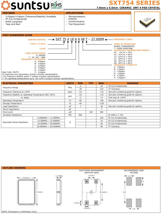 Suntsu晶振,SXT754晶振,SXT75418AA48T-26.000M晶振,貼片晶振本身體積小,超薄型石英晶體振蕩器,特別適用于有目前高速發(fā)展的高端電子數(shù)碼產(chǎn)品,因為晶振本身小型化需求的市場領(lǐng)域,小型,薄型是對應(yīng)陶瓷振蕩器(偏差大)和普通的石英晶體振蕩器(偏差小)的中間領(lǐng)域的一種性價比較出色的產(chǎn)品.產(chǎn)品廣泛用于筆記本電腦,無線電話,衛(wèi)星導(dǎo)航SSD,USB,Blu-ray等用途,符合無鉛焊接的高溫回流焊曲線特性.