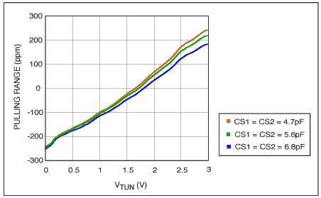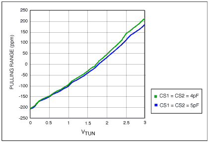 為了限制VCXO的調(diào)諧范圍,我們可以通過改變外部并聯(lián)電容來設置上限.并聯(lián)電容的值在4ps-7ps的范圍內(nèi),具體取決于電路板的寄生電容.另一方面,較低的范圍由內(nèi)部矢量的值確定,其不能在外部改變.為了減少寄生電容對上調(diào)諧范圍的影響,在電路板布局中,我們應該盡量減小石英晶振引腳對地的寄生電容,從而在引腳與接地和電源方案之間提供良好的間隙.