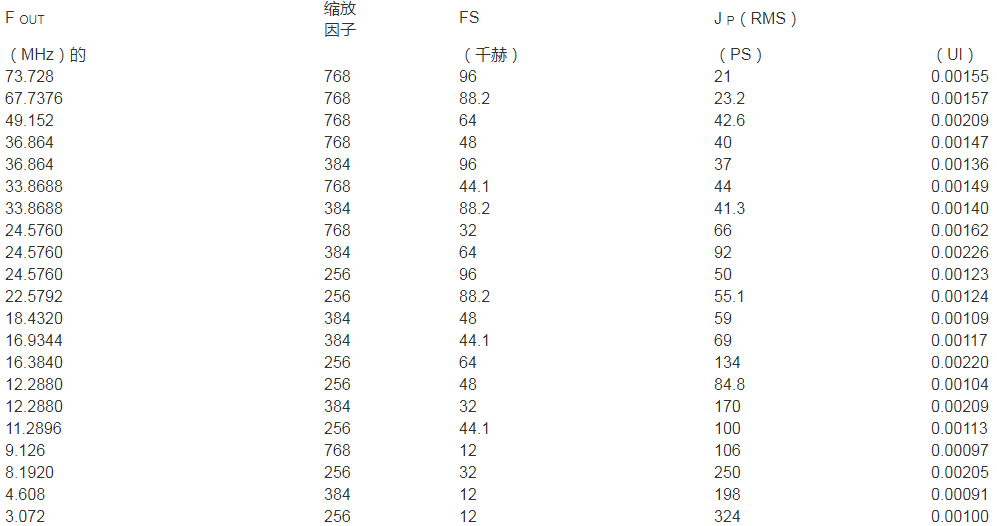 測量輸出CLK抖動的設置對于石英晶體振蕩器,抖動是一項重要的性能測量.有兩種最常用的抖動定義:周期抖動和周期間抖動,見圖3細節(jié).為了測量抖動,我們可以使用高速數(shù)字采樣示波器對大量數(shù)據(jù)進行采樣,并根據(jù)定義計算抖動.Tektronix(TDS7254)或Lecroy(Wavepro960)的示波器使用配備的軟件提供這些測量.我們還可以使用高速數(shù)字示波器來測量時域中的周期抖動.圖3顯示了設置.通過時域方法,我們無法測量周期到周期的抖動.但是,如果每個周期的晶振抖動噪聲是獨立且相同分布的,則周期間抖動是周期抖動的1.414倍.MAX9485可根據(jù)不同的音頻采樣頻率和頻率比例因子產(chǎn)生21種不同的輸出頻率.我們使用了圖4中所示的設置測量所有可能的輸出CLK頻率的周期抖動.