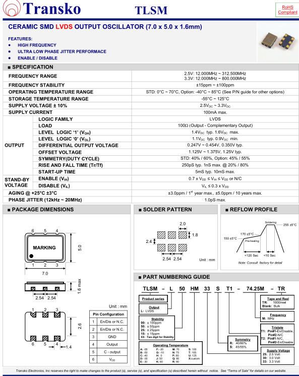 特蘭斯科晶振,TLSM晶振,TLSM-L50HM33ST1-12.000M-TR晶振,小型SMD有源晶振,從最初超大體積到現(xiàn)在的7050mm,6035mm,5032mm,3225mm,2520mm體積,有著翻天覆地的改變,體積的變小也使產(chǎn)品帶來(lái)了更高的穩(wěn)定性能,接縫密封石英晶體振蕩器,精度高,覆蓋頻率范圍寬的特點(diǎn),SMD高速自動(dòng)安裝和高溫回流焊設(shè)計(jì),Optionable待機(jī)輸出三態(tài)輸出功能,電源電壓范圍:1.8V~5V,高穩(wěn)定性,低抖動(dòng),低功耗,主要應(yīng)用領(lǐng)域:無(wú)線通訊,高端智能手機(jī),平板筆記本W(wǎng)LAN,藍(lán)牙,數(shù)碼相機(jī),DSL和其他IT產(chǎn)品的晶振應(yīng)用,三態(tài)功能,PC和LCDM等高端數(shù)碼領(lǐng)域,符合RoHS/無(wú)鉛.