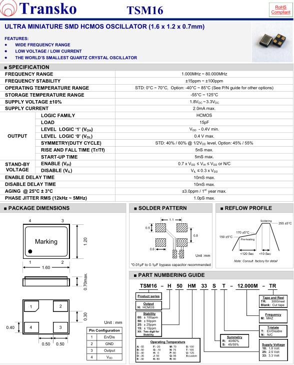 特蘭斯科晶振,TSM16晶振,TSM16-H50HM33ST-12.000M-TR晶振,小型SMD有源晶振,從最初超大體積到現(xiàn)在的7050mm,6035mm,5032mm,3225mm,2520mm體積,有著翻天覆地的改變,體積的變小也使產(chǎn)品帶來了更高的穩(wěn)定性能,接縫密封石英晶體振蕩器,精度高,覆蓋頻率范圍寬的特點(diǎn),SMD高速自動安裝和高溫回流焊設(shè)計(jì),Optionable待機(jī)輸出三態(tài)輸出功能,電源電壓范圍:1.8V~5V,高穩(wěn)定性,低抖動,低功耗,主要應(yīng)用領(lǐng)域:無線通訊,高端智能手機(jī),平板筆記本W(wǎng)LAN,藍(lán)牙,數(shù)碼相機(jī),DSL和其他IT產(chǎn)品的晶振應(yīng)用,三態(tài)功能,PC和LCDM等高端數(shù)碼領(lǐng)域,符合RoHS/無鉛.