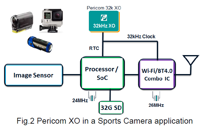 32.768K頻率也常用于手表狗的微處理器作為備用機(jī)制時(shí)鐘.換句話(huà)說(shuō),32.768 khz的存在時(shí)鐘在幾乎所有的應(yīng)用程序是必需的.有兩種方法來(lái)生成這個(gè)32.768 khz的時(shí)鐘.第一個(gè)一個(gè)是使用32.768 khz音叉晶體(晶體)連接到ASIC或核心芯片.,另一個(gè)是使32.768 khz晶體振蕩器(XO)比晶體提供了更多的優(yōu)勢(shì).表1顯示了一個(gè)高水平比較32.768 khzXO和32.768 khz的音叉晶體.一個(gè)獨(dú)特的優(yōu)勢(shì),Pericom XO是同時(shí)開(kāi)多個(gè)負(fù)載的能力.這是用于各種消費(fèi)應(yīng)用程序包括運(yùn)動(dòng)攝像機(jī)、智能手表,和其他這套.圖2顯示了一個(gè)運(yùn)動(dòng)鏡頭應(yīng)用Pericom 32.768 khz的XO是用來(lái)驅(qū)動(dòng)處理器和WiFi /藍(lán)牙芯片.