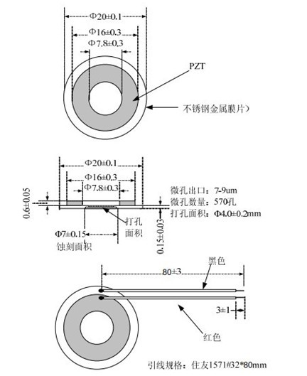 微孔霧化片的工作原理.由于微孔霧化片的頻率和工作電壓都是比較小的,所以它不用放在水里工作,它是噴霧工作是通過中間的微孔噴出來,先把海綿吸棒固定在容器里,在通過設(shè)計把霧化片中間孔徑固定在海綿吸棒上.在通過電流工作(因為微孔霧化片的頻率和電壓功率低,所以不用擔(dān)心會出現(xiàn)燒壞霧化片的問題)把水通過海綿吸棒吸上來.在從中間孔徑噴灑出去.改善房間空氣質(zhì)量,減少干燥保護身心健康.常用的規(guī)格有16mm、18mm、20mm等,常用頻率110khz-160khz之間都可以產(chǎn)生.