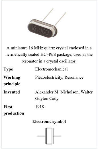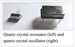 壓電諧振器作為單獨(dú)的元件出售,用于晶體振蕩器電路.圖中顯示了一個(gè)例子.它們通常與晶體振蕩器電路一起集成在一個(gè)封裝中,如右側(cè)所示.