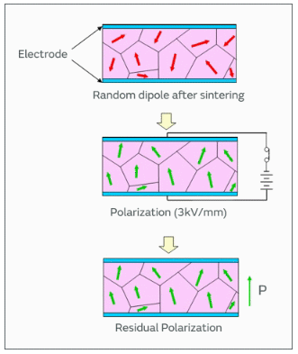 在經(jīng)受燒制之后,鐵電陶瓷將立即產(chǎn)生具有隨機(jī)極軸的自發(fā)極化.總的來說,陶瓷似乎具有良好平衡的正負(fù)電荷.然而,通過施加高DC電壓,由自發(fā)極化產(chǎn)生的極軸在均勻方向上對準(zhǔn),即使去除電壓也不能取消.對準(zhǔn)自發(fā)極化的極軸的過程稱為極化過程.