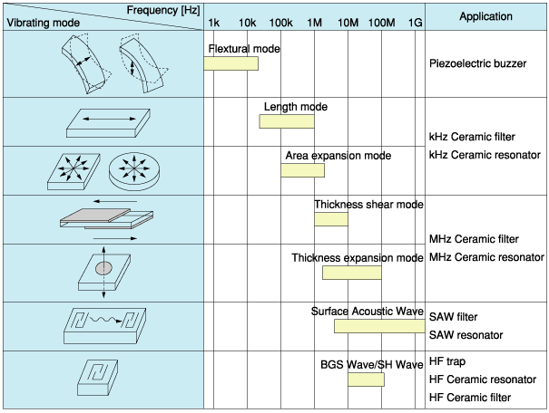 陶瓷諧振器CERALOCK®利用通常的鋯鈦酸鉛(PZT),其提供取決于共振頻率各種振動行為(模式)的壓電陶瓷的機(jī)械共振.通常,石英晶體單元是眾所周知的機(jī)械定時裝置.另一方面,CR和LC振蕩電路是利用電諧振的定時裝置.