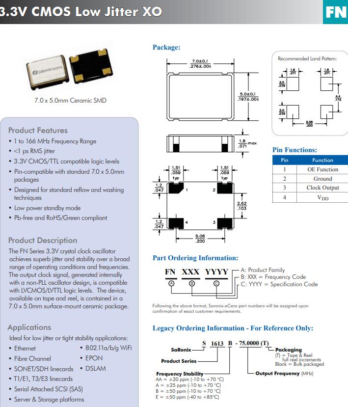 FN系列3.3V晶體時(shí)鐘振蕩器實(shí)現(xiàn)卓越的抖動(dòng)和穩(wěn)定的廣泛操作條件和頻率的范圍。內(nèi)部產(chǎn)生的輸出時(shí)鐘信號(hào)與非鎖相環(huán)振蕩器設(shè)計(jì),是兼容的LVCMOS/LVTTL邏輯電平。的設(shè)備,可在磁帶和卷軸上,是包含在一個(gè)7.0 x 5.0mm表面貼裝陶瓷封裝。應(yīng)用程序