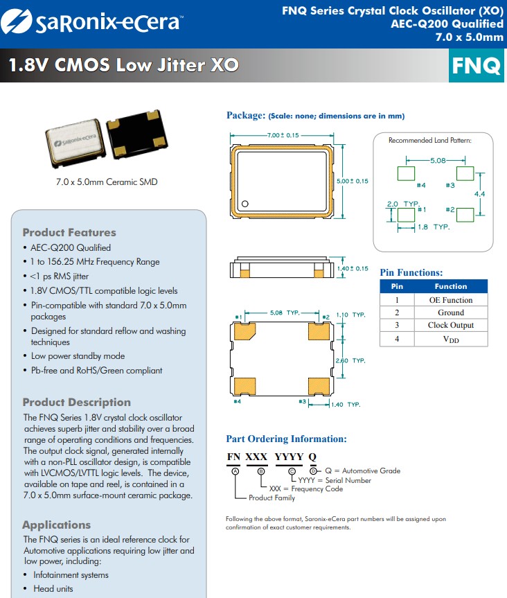 應(yīng)用:FNQ系列是需要低抖動和低功耗的汽車應(yīng)用的理想?yún)⒖紩r(shí)鐘,包括:信息娛樂系統(tǒng),主機(jī)