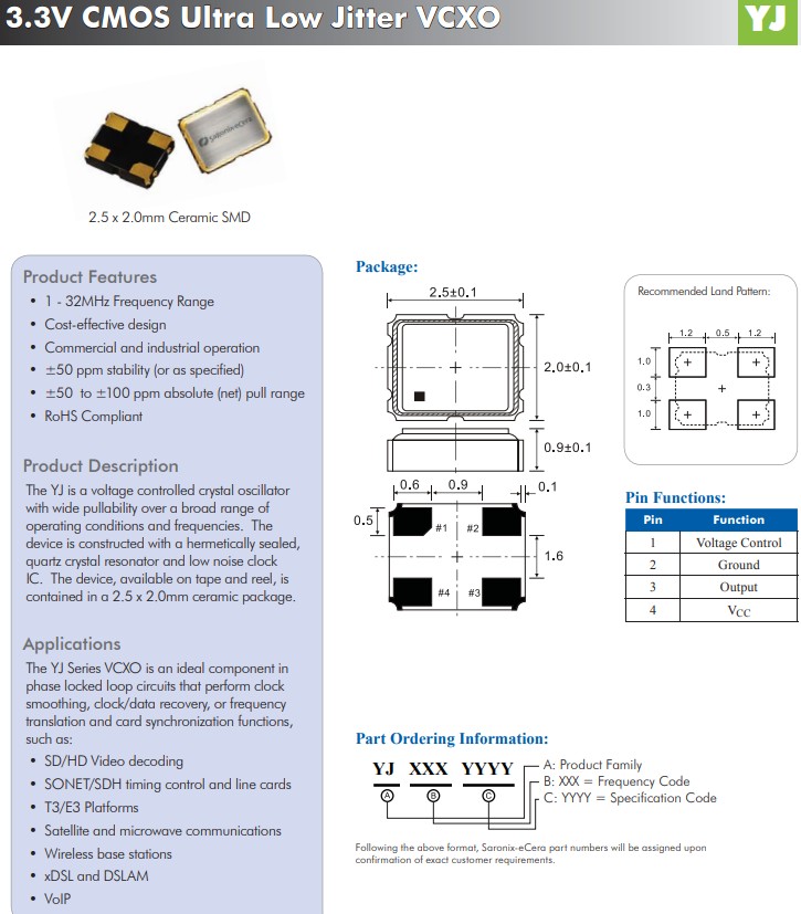 YJ系列VCXO是頻率轉(zhuǎn)換和卡同步功能的鎖相環(huán)電路中的理想組件,JT255BI0032.000000,壓控晶體振蕩器,ECERA晶振