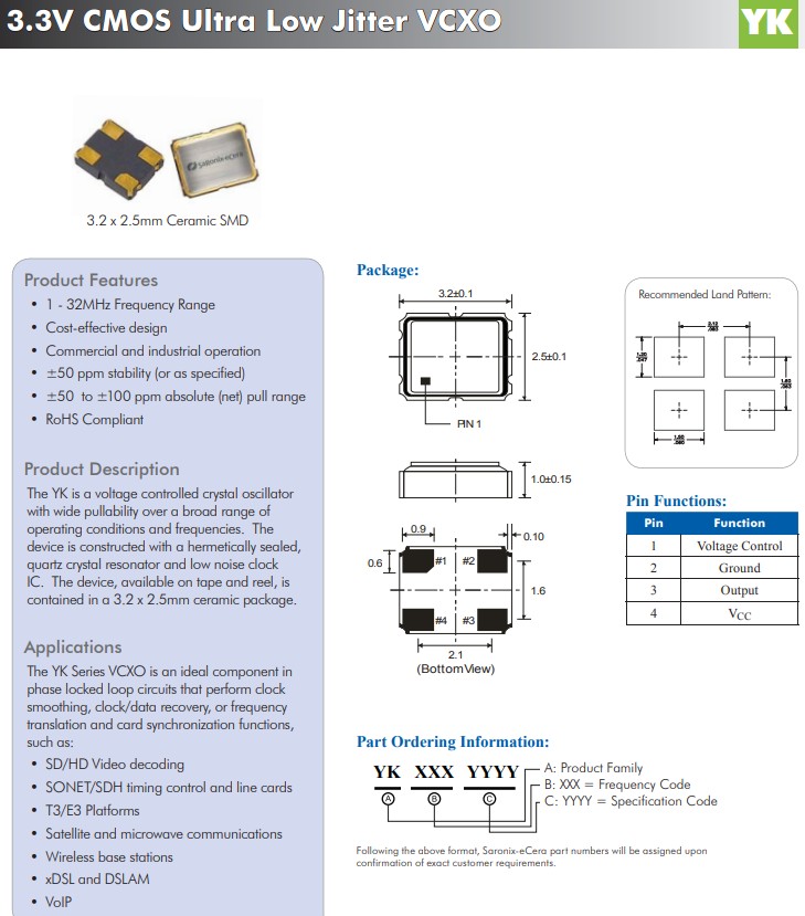 YK 3.3V None CMOS 1 to 66 <2 ps RMS Ceramic Seam 3.2 x 2.5 x 1.0 4 超低抖動