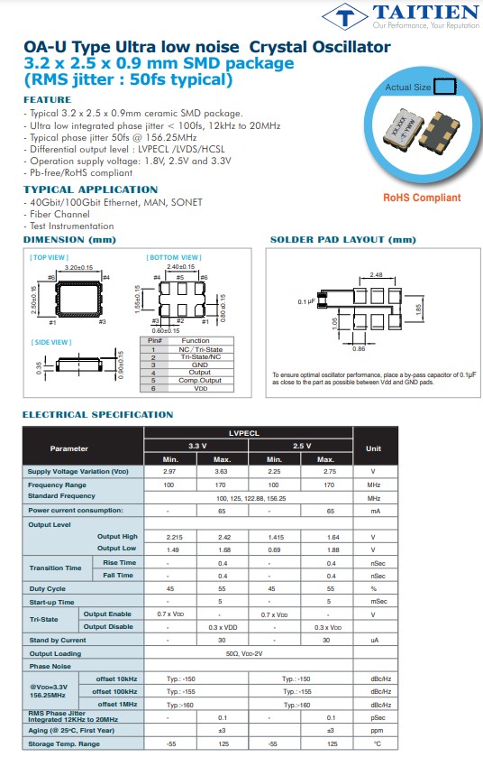 Leveraging Taitien’s vertical integration production of quartz wafers and low phase noise oscillation circuit design technology, the newly launched OA-U series further strengthens the product performance of Taitien’s crystal and oscillator solutions. The OA-U series is available from 100 MHz to 175 MHz with the phase jitter= 100 fs rms, maximum. There are 3 logic outputs: LVPECL, LVDS and CML and the supply voltages are 2.5 V and 3.3 V. The frequency stability maybe specified as tight as ±25 ppm over -40°C to +85°C or ±50ppm over -40°C to +125°C.