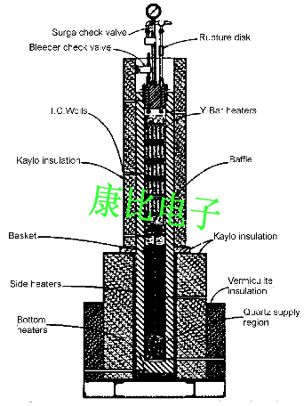培養(yǎng)的石英在稱為高壓釜的大型壓力容器中生長(zhǎng)(參見下面的示意圖).高壓釜是一個(gè)金屬圓筒,一端封閉,能承受高達(dá)30,000磅/平方英寸的壓力,內(nèi)部溫度為700至800°F.它通常高12至20英尺,直徑2至3英尺 將純的但未面對(duì)的石英晶體諧振器中的石英(尺寸為1至1.5英寸)的小碎片(稱為“lascas或營(yíng)養(yǎng)物”)放置在金屬絲網(wǎng)籃中并降低到容器的下半部分中.帶有預(yù)先安排的孔的鋼板,稱為“擋板”,設(shè)置在籃筐的頂部.擋板用于分離生長(zhǎng)(種子)區(qū)域和營(yíng)養(yǎng)區(qū)域,并幫助建立兩個(gè)區(qū)域之間的溫差.適當(dāng)取向的單晶板(天然的或培養(yǎng)的),稱為"種子",安裝在架子上并懸掛在容器上半部的擋板頂部.然后將高壓釜用堿性水溶液(碳酸鈉或氫氧化鈉)填充至其自由體積的約80%,以允許將來(lái)的液體膨脹,并用高壓封閉物密封.然后通過連接到圓筒外圓周的一系列電阻加熱器使高壓釜達(dá)到工作溫度.隨著溫度升高,壓力開始在高壓釜內(nèi)形成.溫度為700至800在容器的下半部分達(dá)到°F,而上半部分保持在比下半部分低70至80°F的溫度.