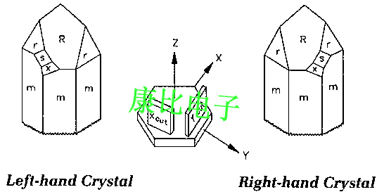 α-石英屬于晶體學(xué)類32,它是六角形棱柱,每端有六個(gè)帽面.棱鏡面指定為m面,蓋面指定為R面和r面.R面通常被稱為主要菱形面,r面是次要的菱形面.左手和右手晶振都是自然發(fā)生的,可以通過S面和X面的位置來(lái)區(qū)分. 如上面的示意圖所示,α-石英晶體具有三重對(duì)稱的單軸(三角軸),并且它具有與該三角軸垂直的三個(gè)雙重對(duì)稱軸(二軸).二維軸間隔120°并且是極軸,也就是說,可以為它們分配一定的感覺.極軸的存在意味著缺乏中心對(duì)稱性,并且是壓電效應(yīng)存在的必要條件.二軸也稱為石英電軸(x軸,y軸).在具有完全發(fā)展的自然面的晶體中,每個(gè)極軸的兩端可以通過S面和X面的存在或不存在來(lái)區(qū)分.當(dāng)在電軸方向上施加壓力時(shí),在由這些面改變的軸的那一端產(chǎn)生負(fù)電荷.三角軸,也稱為光軸(z軸),不是極性的,因?yàn)榕c其垂直的二軸的存在意味著三角軸的兩端是等效的.因此,沿光軸不會(huì)產(chǎn)生壓電極化.在直角坐標(biāo)系中,z軸平行于m個(gè)棱鏡面.以其垂直于x軸的主表面切割的石英板稱為X切割板.將切割繞z軸旋轉(zhuǎn)90度給出Y切割板,其y軸現(xiàn)在垂直于主表面.由于石英晶體具有六個(gè)棱鏡面,因此x軸和y軸存在三種選擇.選擇是任意的;每個(gè)行為都相同.