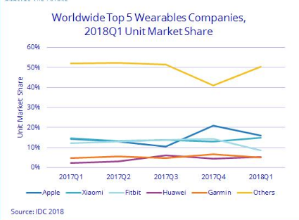 2018年第一季度,全球可穿戴設(shè)備的貨運(yùn)總量,僅僅取得了1.2%的增長(zhǎng),數(shù)量為2510萬(wàn)件。與一年前18%的同比增長(zhǎng)相比,今年第一季度,該市場(chǎng)的增長(zhǎng)已經(jīng)低出很多。其中,很大一部分原因,是基礎(chǔ)可穿戴設(shè)備的貨運(yùn)總量出現(xiàn)了9.2%的下降。 在此同時(shí),較高價(jià)格的可穿戴設(shè)備例如Apple、Fitbit以及知名時(shí)尚品牌的產(chǎn)品,出貨量在第一季增加了28.4%;這顯示消費(fèi)者的偏好持續(xù)轉(zhuǎn)向更具智能性的設(shè)備。