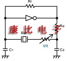 2.插入與晶體單元串聯(lián)的可變電阻器(VR),并將可變電阻器的值從振蕩停止狀態(tài)改變?yōu)檎袷庨_始.振蕩開始時VR的值是負電阻(-R).