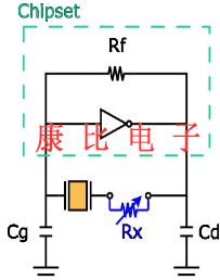 步驟1-5.下圖顯示為一般振蕩電路,其中Cd和Cg是外部負(fù)載電容,Rf是反饋電阻,Rd是限制電阻. 負(fù)電阻(-R)是評(píng)估石英晶體振蕩器振蕩電路質(zhì)量的標(biāo)準(zhǔn),其值應(yīng)至少是晶體電阻的五倍,以保持穩(wěn)定的振蕩.因此,按照以下說(shuō)明測(cè)量負(fù)阻是非常重要的: (1)將電阻(Rx)與貼片晶振串聯(lián)連接