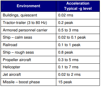所有電子產(chǎn)品在其壽命期間都會受到?jīng)_擊和振動.力的范圍從口袋或背包中攜帶的移動消費品所經(jīng)歷的運動到工業(yè)設備或航空航天應用的高振動水平.甚至建筑物中的固定產(chǎn)品也可能會受到附近風扇或其他設備的振動.因此,重要的是要考慮石英晶體振蕩器在沖擊和振動情況下的表現(xiàn).表1顯示了各種環(huán)境下的典型加速度水平.