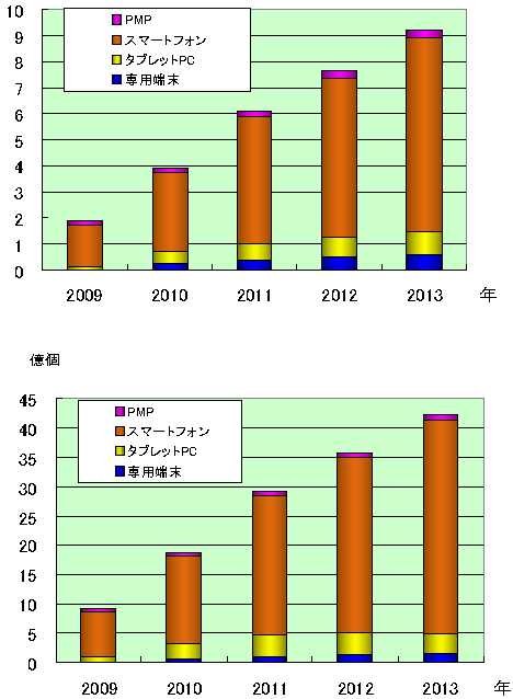 2009年的電子書籍臺數(shù)不到2億臺,但2010年為不到4億臺,約為2倍,預(yù)測2011年以后也會穩(wěn)定增長的市場.