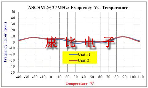 這一先進(jìn)的MEMS振蕩器系列采用傳統(tǒng)的分?jǐn)?shù)合成方法,并配有溫度校正電路.該技術(shù)可在-40ºC至+105ºC的耐高溫晶振寬工作溫度范圍內(nèi)實(shí)現(xiàn)±10ppm的溫度穩(wěn)定性.圖(4)描述了Abracon的ASCSM系列MEMS振蕩器的典型溫度誤差.