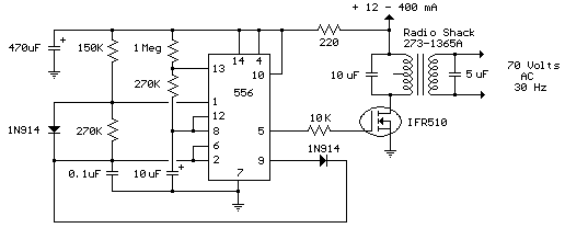 該環(huán)形發(fā)生器每10秒鐘響一次電話.通過改變1Meg電阻的值,可以延長或縮短環(huán)之間的間隔.70伏/30赫茲環(huán)電壓由小型12.6VAC電源變壓器(RadioShack273-1365)的120伏側(cè)產(chǎn)生.連接在變壓器繞組兩端的兩個電容器都是非極化/100伏特.在振鈴間隔期間,電路從12伏直流電源吸收大約300mA電流.